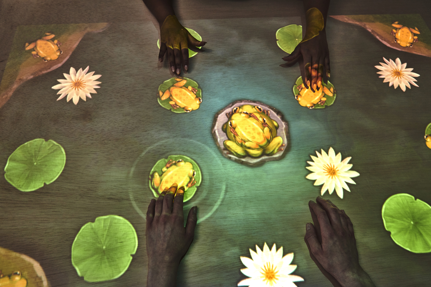 Des grenouilles apparaissent à chaque coin de la table. C’est aux joueurs de les guider vers leur mère. Notez que les grenouilles ne peuvent sauter que sur les nénuphars et non sur les fleurs. Il faut parfois être patient. Cela permet de pratiquer la maîtrise de soi et le sens du timing. Un objectif partagé encourage l’interaction sociale. Lorsque l’objectif est atteint, une surprise musicale vous attend !